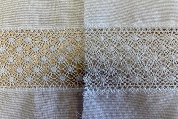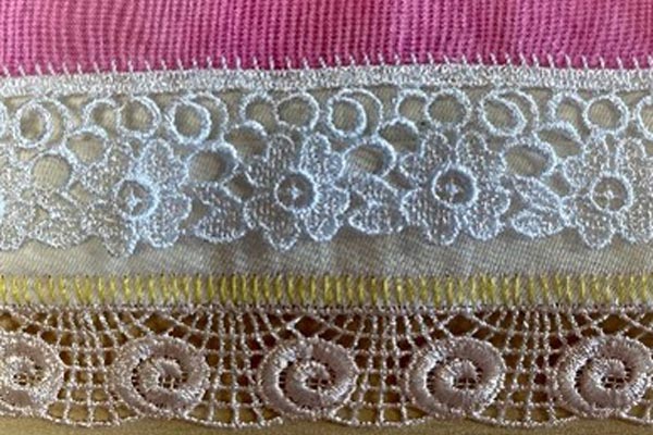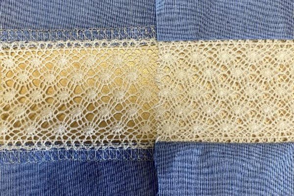 La dentelle peut également se poser avec une surjeteuse, une recouvreuse et également une machine combinée surjeteuse/recouvreuse.