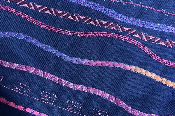 Le Yarn Couching est souvent utilisé pour ajouter des détails décoratifs aux textiles, notamment en broderie contemporaine, en patchwork, ou même dans certains travaux d’art textile.