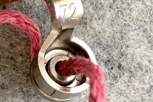Le pied pour tressage est un excellent pied pour le couching classique. Le grand trou biseauté du pied permet d’y insérer facilement les fils et cordons pour la couture.