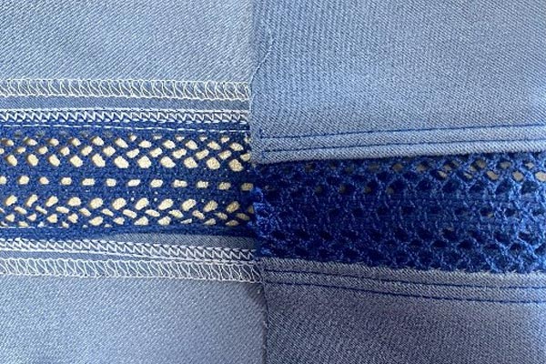 La dentelle peut également se poser avec une surjeteuse, une recouvreuse et également une machine combinée surjeteuse/recouvreuse.